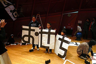 ▼2011-08-10 10:55 豊橋市美術博物館「素材の冒険」展 ワークショップ 昨日、豊橋市美術博物館「素材の冒険」展の、夏休みワークショップ「土の色で遊ぼう」を無事終了。豊橋公園で土を採取し、顔を描いた。 多くの人は土は自然のなかどこにでもあると考えている。もちろん、どこにでもある。しかし、水に恵まれた日本では、土は露出してもすぐに草木で被われてしまう。土が露出した所とは、、実は自然が破壊された現場なのだ。希望の土を手に入れるのはそう簡単ではない。それを人に例えれば、事故にあい、皮膚が敗れて出血し、肉が露出した状態である。そのことを知ったのは土で制作し始めてすぐだった。 人が生活し、活動が繰り返された土地は、土が混ぜ合わされ本来の色ではない。豊橋公園は、吉田城や市庁舎そして動物園と、永年使用されて来た場所だ。果たして、希望通りの採取が可能か心配したが、子供たちは想像以上に順応できていた。 気がついたことをいくつか。 最も問題なのは、一組の親子。いや一人の母親。最初から最後まで子供に付きっきりで世話し、絵を描くことまで手を出す始末。 仲良し友達との参加、描く絵まで影響しあってそっくりになっていた。絵を描くことは、個の反映なのだが、小学生にして、個の主張と友情は両立しないと無意識に感じ取っているのだろう。 たかが絵、されど絵である。絵を描くこと、それは処世術でも、錬金術でもない。自我の確立こそが「描く」ことの本質なのだが。 参加者は小学生30人。おおむね自らの意志で頑張って描いていた。それは救いだった。 子供たちは塗りにくい土を必死で画用紙にこすりつけていた。その必死さが実は「何かを生み出す」のだ。これは、塗りやすく調整された既製の絵の具からはけして生まれない。生み出された「何か」から真理を見つけ出す。それが「美術」なのだ。 心配していた漫画の影響はたった一人。これも土という描きにくい画材ゆえだろう。 終了して子供たちと記念撮影。作品はしばらく美術館に飾られる。 ▼2013-01-07 11:01 愛知県児童総合センター ワークショップ あけましておめでとうございます。 昨年は28日に仕事納め、それから、一夜明けて29日から、熱を出し、 とうとう、正月3日まで下がらず。一歩も外に出れず、正真正銘の寝正月を過ごしてしまった。 4日は一日静養。5日は朝から、長久手の愛知県児童総合センター(ACC)で子供たちへのワークショップ。2013年の仕事初めだ。 企画のタイトルは「もじ・もじ ファクトリー」。文字をテーマに子供たちと、さまざまな遊びを体験しようという試みだ。ここACCではこれまで、こどもに媚びないさまざまな試みを実践、全国のこどもも施設の先駆的なスタンスで知られている。 会場に展示されている、こどもたちの文字の遊びの結果はこどもたちだけでなく、大人はもちろん、私のような、その道の一応プロの端くれにも十分刺激に満ちあふれ、そこらの画廊で開かれる、デザイン展など比較にならない面白さだった。こどもだけでなく、プロの作家たちにも見てもらいたい展示だ。 左より、あいうえの本:ひらがな一文字を自由に書いた(描いた)本。もじ虫:粘土でつくるもじの形をした虫たち。もじもじファクトリーポスター:さまざまな素材を貼付けて作った文字を判にしている。読めない文字:文字のような形を作って、伝えられないことを伝える。 FONT1000の作品も会場に並んでいる。センターのあちこちに貼られた、FONT1000のフォントの「も」の字探し。 いよいよ私のワークショップ「かきぞめ」。用意した5つのパターンと白と黒の紙。合わせて7種類を組み合わせ、新年らしい言葉を作る。 パターンは一辺20cm、予想はしていたが、それ以上に大きな文字になっていく。 それぞれが、面白い文字を作っていく。 広い会場、一杯に書き初めを展示して無事終了。年の初めらしい、楽しい体験をさせてもらいました。今年一年も、楽しく過ごしたいものです。 ▼2014-09-12 17:15ハ 名古屋金山 金山ぐるりタイムトンネル ワークショップ 一ヶ月ほど前になるが、金山ぐるりタイムトンネルという、子供向きのワークショップに参加した。 江戸の文化がテーマだった、私は和算や算額絵馬を素材にして、算数の教科書を描くという、ワークショップを開いた。大きな和紙に、数学の数式のようなものを、自由に子供たちに描いてもらった。子供たちはさすがに素晴らしい、このまま素直に育っていくことを願う。 午後からは和紙の下敷きにしたベニヤ板を使用して、昼休みに街で集めてきた、印刷物をコラージュして、白の水性ペイントと墨とコンテで描く。 写真は最後にまとめたもの、これはこれで良いのだろうが、白の水性ペイントと筆の使用はなかなか難しいと感じた、コンテに比べ抵抗がなく自由に描けることが、はたして、結果の自由さに結びつくのか。子供たちにはどの素材が相応しいのか。この問題は我々にも共通する課題である。 もう一つの課