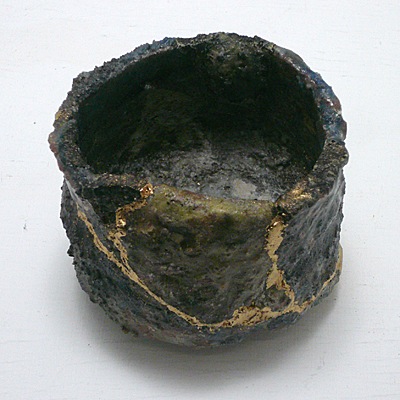 ▼2013-08-08 10:47 初めての木炭窯 奮闘記3 かの木炭窯は木炭を上から投入し、その木炭が燃焼し、その灰を釉薬とするため、通常の窯のように棚板で内部を分け器を階層で焼くことができない。ハつまり、窯の底面に並ぶ量しか焼けないのである。その上、器と器の間も木炭が落ちるスペースが必要。そのため、底面だけでは、大ぶりなぐい呑みを18個並べるのが精一杯。そこで、道具土を間にはさみ、3段重ねて焼成することにした。これで54個が焼けることになった。 ところが、掛けた釉薬はもちろん、木炭の灰が道具土にまで降り注ぎ、一体になってしまったものも多い。それを分解している内に欠けてしまった部分もある。それらは金継ぎすることになる。 金継ぎの問題は接着剤である。市販されている接着剤の殆どは有機溶剤が使用されているので食器には使えない。漆は、乾燥の面倒なことや「かぶれ」が怖くてできれば使用したくない。 いろいろ調べたら、高機能天然漆、NOA漆というものが見つかった。最近、工芸漆とか、新漆の名で市販されている接着剤は名こそ漆だが、天然漆とは全く違う。しかし、NOA漆は天然漆の上にかぶれにくく(かぶれないということではない)漆風呂を使用せずとも低温で低湿度(温度25度、湿度45〜50%)で4〜5時間で乾燥するという。さっそく、透スグロメ(透明)と黒スグロメ(黒)の2種を注文して金継ぎを始めた。 道具土の痕を金継ぎする。そのままでもよいのだが、金継ぎが景色となる。 ひどく割れ、大きな部分が使えず、別の器の欠片を使用。同じ灰釉だが、濃度違いが面白い。 上下にできた道具土の痕を金継ぎ。下だけの金継ぎでもよいのだが、バランスで上部の道具土の痕も金継ぎする。 大きな欠けも金継ぎすると、一層豪華になる。手間を考えれば、普通は捨てるようなものだが… 。 道具土の部分が上の器と炭の重みで沈んでしまい、片口のようになってしまったぐい呑み。挙げ句に、見込みの底には、はずれてしまった高台の欠片がはりついている。 念のため、長袖、使い捨てのビニール手袋使用で金継ぎ作業開始。仮に金が完全に蒔けない場合でも、黒が透けて見えるのならばかまわないとハNOA漆黒スグロメだけを使用した。作業終了後、そのままアトリエに並べておいたが翌朝には完全に乾燥。心配のかぶれも全くなし。NOA漆は優れものだ ▼2013-08-20 初めての木炭窯 奮闘記4 木炭窯に再度挑戦。前回の窯ではロストルからの空気の取り入れを自然の換気にまかせ、次々に木炭を投入し、長時間(通常の薪窯と比べれば短時間だが) かけて温度を上げた。その結果、器には膨大な灰が降り注ぎ 灰が熔けきらず表面のざらつきが強くなりがちだった。自然な供給にまかせていた空気を扇風機を使用して強制的に送り込み。温度を上げることに専念することにした。つまり、刀鍛冶やたたら製鉄の方法である。 少し欲張り、内部に棚を数段作り、器を置き、大きく開けた隙間には木炭を詰め、最下部には特に大量の炭を詰め、点火した。予想では、一気に木炭に火が回り、内部は高温になる筈だった。しかし、木炭を入れすぎ、いくら扇風機で空気を送っても酸素は不足し、なかなか、窯の上部まで火が回らない。直ぐに、間違いに気付いたが、あとの祭り。それでも、木炭が燃え、量が減るにつれ、酸素の供給と燃焼が調和しだし、下部では温度が上がりだす。 点火して、3時間。火力の勢いが落ちたころで、ロストルと煙突を閉じて終了。なんとも短時間で楽な窯焚きである。点火すれば眺めているだけである。 翌日、窯出し。上部は、予想通り素焼き状態。しかし、下部の器は黒釉が熔け、温度の上がりにくい見込み部分も大丈夫。 黒釉が柚子肌となり、全体がつや消しの中に一部光沢の黒となり、変化が面白い。 専門家によれば、急激な温度上昇は割れの原因とか、短時間の焼成では釉が熔けないという。結果から判断すれば、必ずしもそうではない。さっそく、水を注ぎ、漏れと焼きしまりの度合いを試してみた。同じ土、釉を使用しても、温度が上がらなかった場合は、その多くが水漏れしたのだが、結果はよく釉が熔け、十分に焼けしまっている。たった3時間燃焼するだけなので、木炭の使用も前回の半分以下となり、次回もこの方法が有効なようだ。 最下部の棚板が割れ落ちた、急激な温度上昇が原因なのか、もともとひびがあったのか、定かではないが、恐らくその両方なのだろう。抹茶茶碗が落ちた棚板に三つほどおされ、変形してしまった。 写真では、変形がひどいが、手に収めればしっくりし、 けがの巧妙といえそうである。 次は、今回素焼き状態で終わった器を今回と同じ方法で二度焼きする。それで「木炭窯」との戦いを終了し、そろそろ、10月にせまった個展(陶器の展示ではない。)の準備をしなければ… 。 ▼2013-12-19 14:54 ぐい呑 百展 初めて器の展覧会を行うことになった。これまでも、陶板として大皿を展示したことはあったが、それは画面としての皿